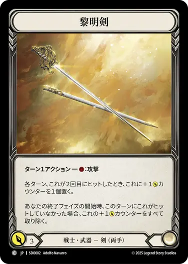 ただし、《黎明剣》を2回ヒットさせるには3つのハードルがあります。それは「①《黎明剣》に続行をつけること」「②1回目の攻撃をヒットさせて《ドリンシア》の能力を誘発させること」がまず必要で、その後「③2回目の攻撃をヒットさせこと」を満たしてようやく《黎明剣》に+1カウンターが1つ乗るわけです。