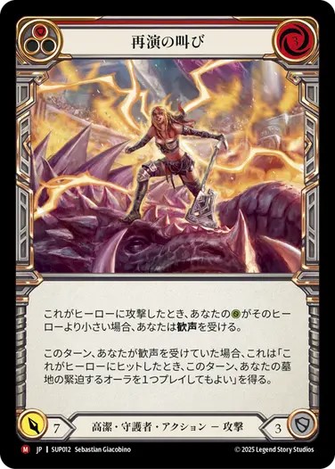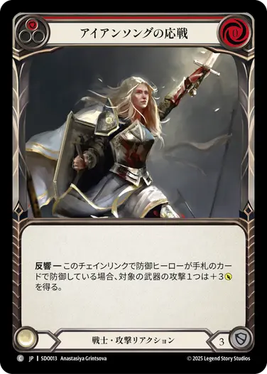 ただし、「反響」能力は手札から防御してもらえないと弱いカードであるものが基本。格納庫からの防御リアクションや装備品、軽減能力などでヒットを防がれてしまうと苦しい展開になってしまうのは注意。相手が手札から防御したくなるように《Steelblade Supremacy》をプレイしたり、《ソードマスターの威光》や《Puncture》のような「反響」に依存しない攻撃リアクションの使い方も大事です。