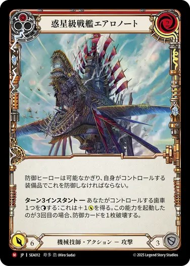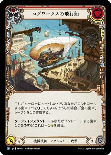 歯車があると非常に強力になる《コグワークスのダブテイル》《コグワークスの飛行船》《惑星級戦艦エアロノート》といった攻撃アクションをプレイしていきましょう。《惑星級戦艦エアロノート》の強制的に装備を防御に出させて、破壊可能な能力は相手によってはゲームを決めるパワーがあります!