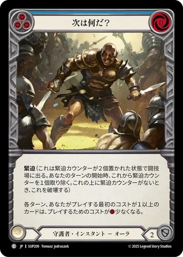 青い0コストの緊迫オーラ《これ以上待てない》《今日はここまで…》《次は何だ?》の3種は維持するターンが長いほどお得なので、《プレアデス》の能力を使用して《前のめり》、《すべてを手中に》等のオーラからこれら3種の緊迫オーラにカウンターを移し替えて行きましょう。特にコストを軽減する《次は何だ?》があれば緊迫オーラを複数枚並べやすくなります。