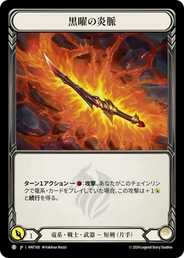 武器《黒曜の炎脈》は《ファング》用の武器であり、《黒曜の炎脈》の攻撃中に例えば《忠誠の儀》をプレイすれば4点続行になります。武器《黒曜の炎脈》のコストが0になっていれば0コスト4点の攻撃が連続して可能!というのが《ファング》の真骨頂です。