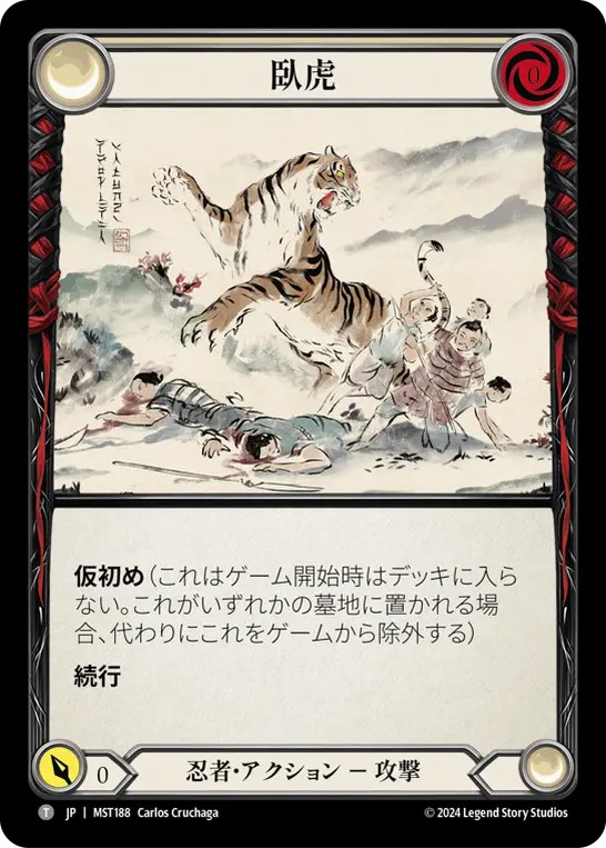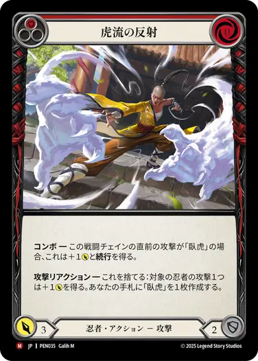 《虎流の反射》のリアクション能力を使用した後、ヒット時に《カツ》の能力で手札に作成した《臥虎》トークン捨てることで実質手札消費なしで+1の修正が可能です。