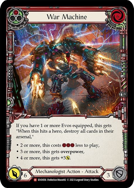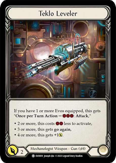 4部位とも「変形(=Evo)」している装備の場合、《Terminator Tank》と《War Machine》は3コスト9点凌駕にヒットで手札or格納庫破壊と、かの《王位の切り倒し》のようなスーパーバリューカードになります。武器《Teklo Leveler》も1コスト3点続行と破格のスペックに。