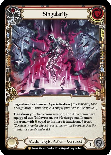 《Singularity》はややこしい能力ですが、武器と4つの「変形」装備を一つの束にして裏面の《Teklovossen,the Mechropotent》に変身するという能力。変身後は3コストと2枚のソウルを追放することで攻撃値6+手札破壊の攻撃が可能。ソウルはこれまで「Evo」により重ねてきた装備の数だけ増えるため、重ねた「Evo」の数がそのまま弾の数になるイメージですね。