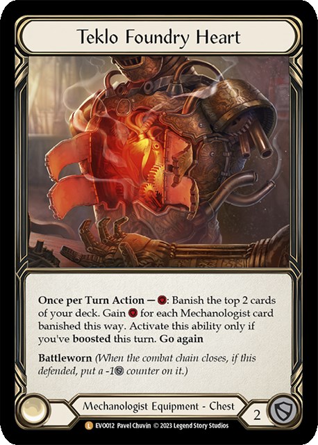 《Teklo Foundry Heart》は2点「戦傷」と優秀かつ、能力を起動してデッキトップから2枚追放した際に「Evo」を持つカードが追放された場合、《Teklovossen》の能力で使用可能=疑似的な手札増加となり強力です。