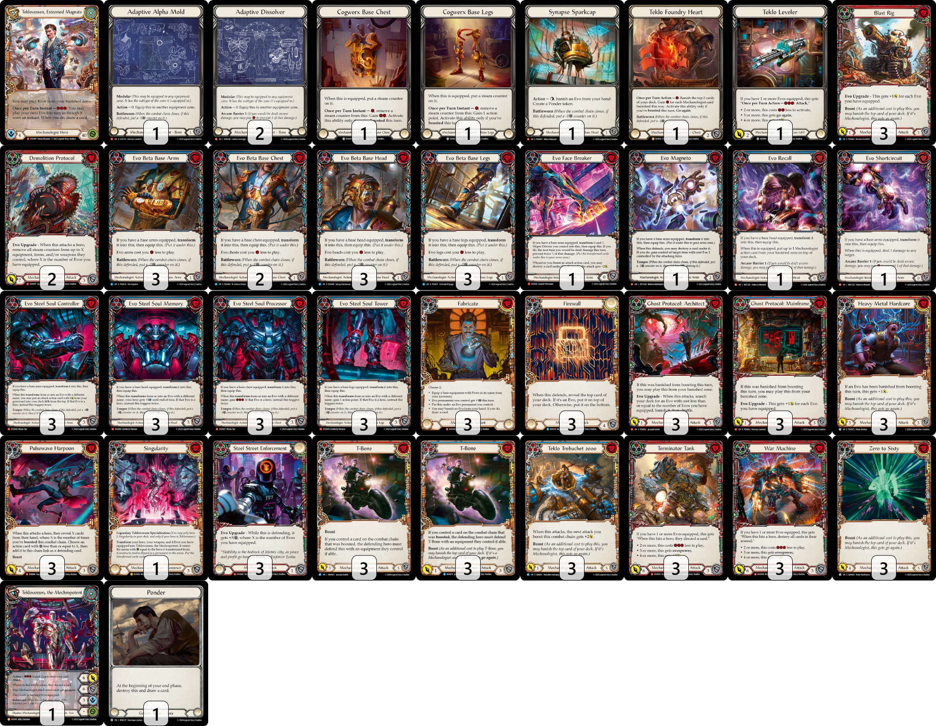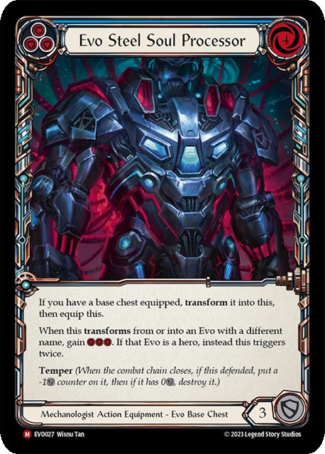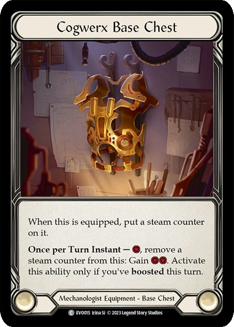 相手によって《Teklo Foundry Heart》と「基本」である《Cogwerx Base Chest》を付け替える運用でしょう。《Singularity》や「Evo」の数を参照して強化されるカードの条件を4つで満たすために、ほとんどの場合「基本」を持つ装備を4枠に装備して始めるのが一般的でしたが、アグロデッキ相手には《Singularity》をする余裕はなく、かつ「Evo」の数も条件3まで達成すれば十分強力、という判断でしょう。