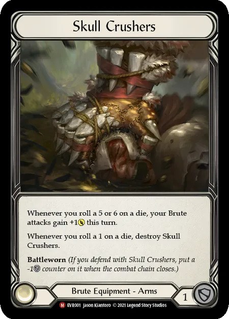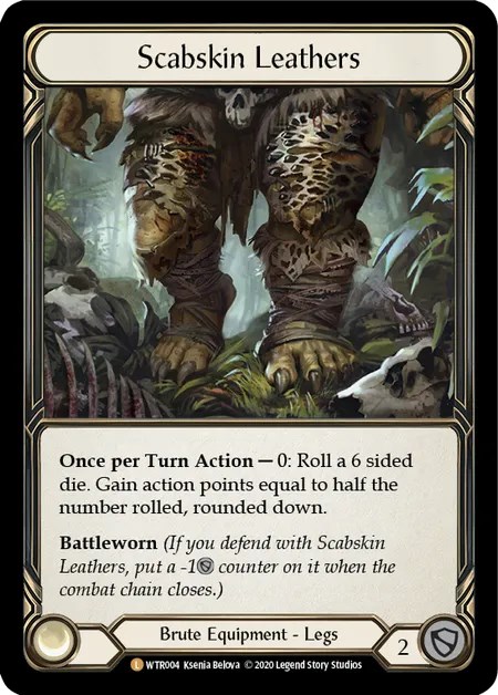 基本的に多くの対面では《恐王の篭手》を使用するらしく、《Skull Crushers》は《オシリオ》相手など、ゲームを早急に終わらせたいマッチアップで装備するそうです。ダイスを振るカードは足装備《Scabskin Leathers》のみですが、その効果で5-6が出せていた場合、アクションポイントが増加しており、複数回の攻撃が可能なので、2-3点の強化が見込めます。