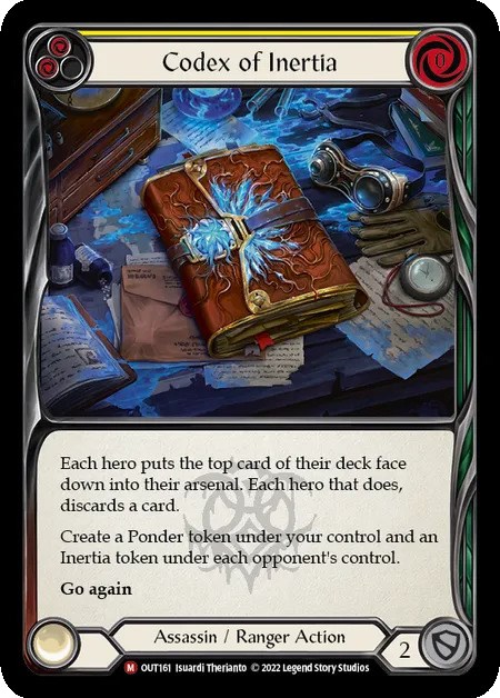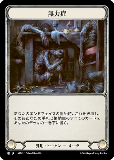 2.《無力症》(=Inartia)トークンにより、次のターンの相手に格納庫を置かせない。これにより《オシリオ》のコンボの準備を邪魔したり、ファティーグデッキの格納庫の防御リアクションを封じることが可能。相手の防御札は4枚だが、こちらの攻め札は5枚という状況を作れる。