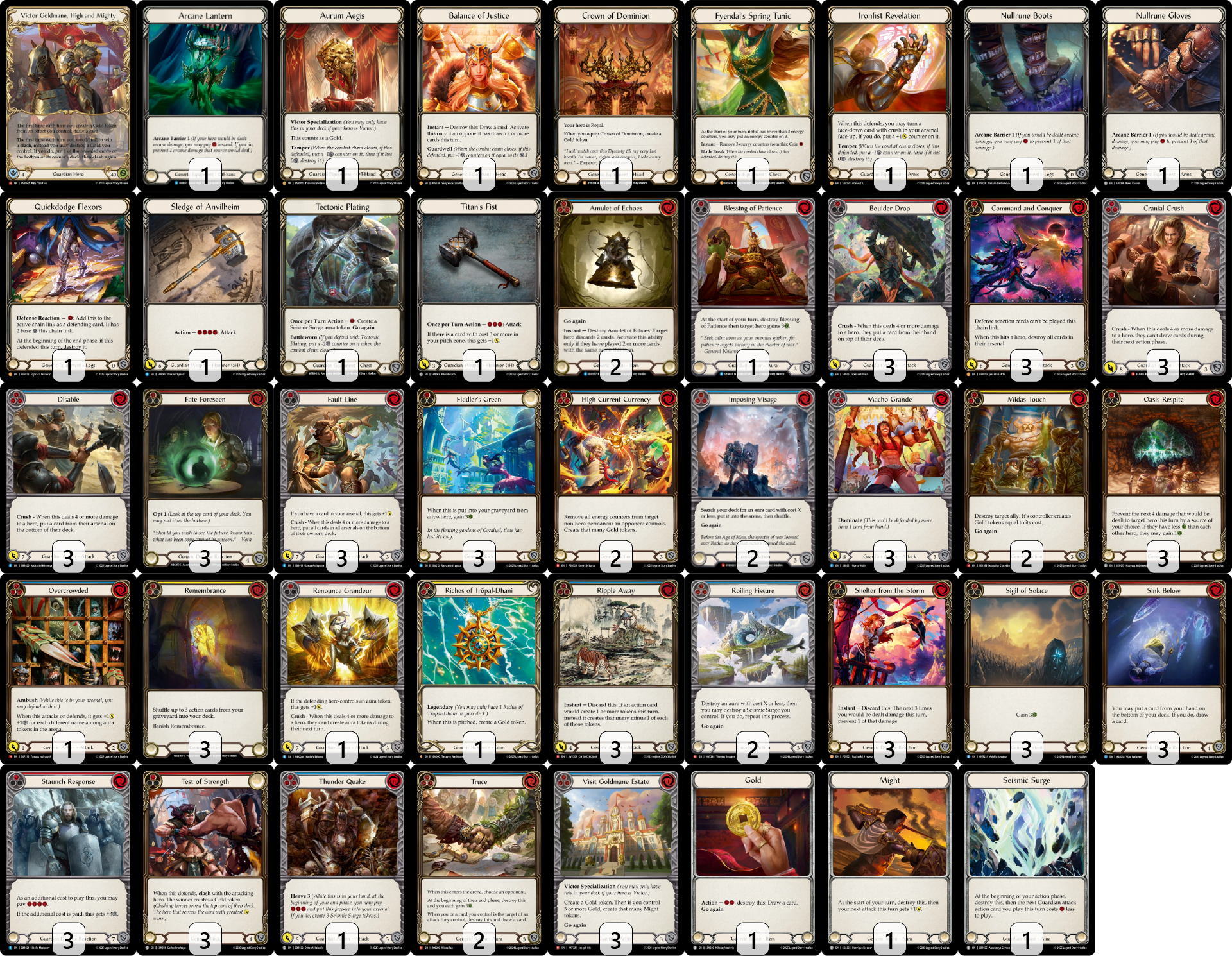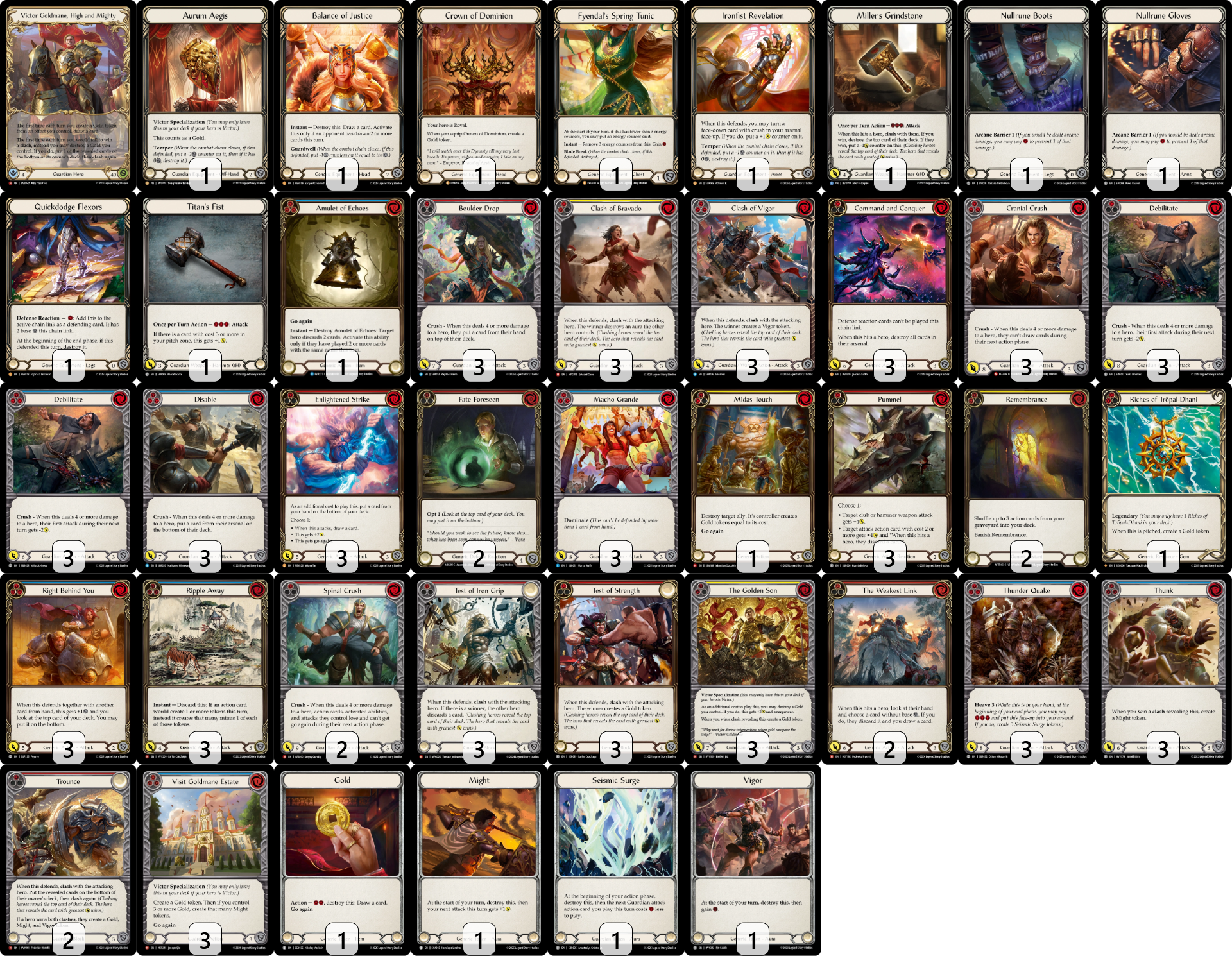 このリストはオーソドックスな《ヴィクター》のリストとなっており、戦略としてはシンプル。《強さの試練》《鉄拳の試練》等で一枚防御7点分の表現価値を出しつつ、「粉砕」持ち攻撃アクションや《征服の命令》などで相手を殴っていくミッドレンジです。