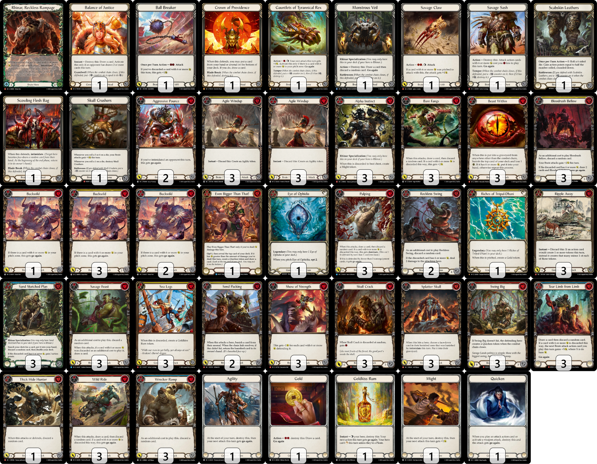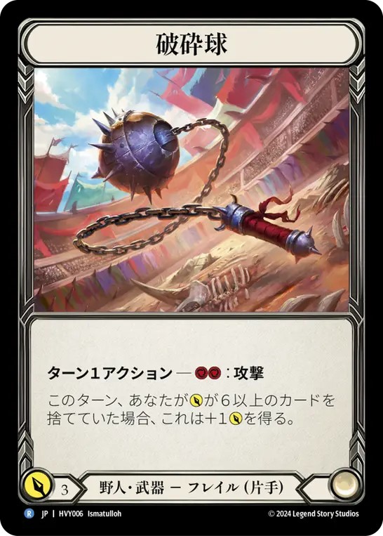 《Meataxe》型は安定感は増していますが、黄色ピッチの多さから《Bloodrush Bellow》のターンに打点が伸びづらい、防御にカードを複数枚使用する防御的な戦闘スタイルになっており「防御的な相手に強い」という《ライナー》の長所が薄れているといった点があります。《ライナー》らしい長所を出すために、《下顎の鉤爪》の代わりに《破砕球》と《荒涼の鉤爪》を装備するスタイルになったのでしょう。