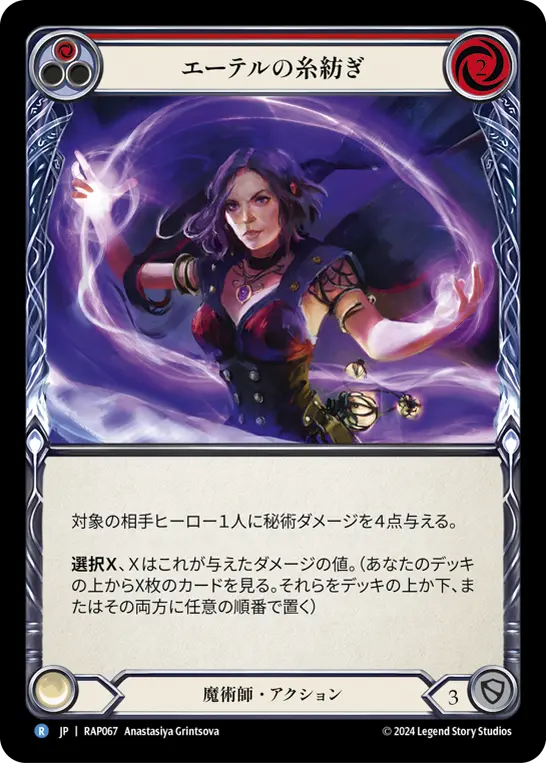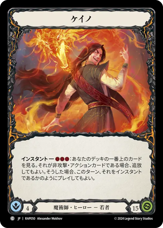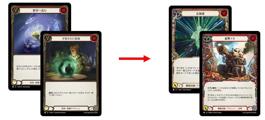 《Broodrush Bellow》や《荒ぶる騎乗》、《Tear Limb from Limb》などのドローが絡むアクションカードをプレイするのに《オフィディアの瞳》をピッチした場合、ドロー効果の前に「選択2」が誘発するので、引きたいカードをデッキトップに残せます。