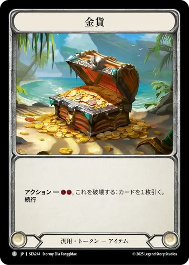 《トロパル=ダニの財宝》はピッチした際に《金貨》トークンが作成されますが、《金貨》トークンを割ることで《Broodrush Bellow》の後、リソース過多の青い手札になってしまった時に赤いカードを引き込みに行ったり、胴装備《野獣の蛮帯》で浮いたリソースをドローにできます。