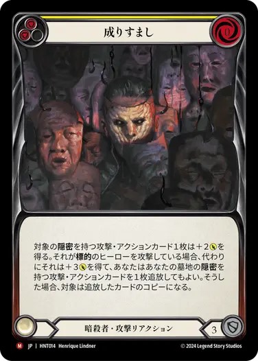 《成りすまし》は「隠密」を強化するカードなので、「短剣」を強化するカードと引いたり、「隠密」が引けていないと使いづらい点や、「次のターン隠密が引けずに《Codex~》を引くと事故になる」といったリスクから格納庫に置きづらいというネックがある攻撃リアクションですが、《死の接吻》を増量できる点はファティーグデッキや《ヴィクター》相手に大きな意味を持ちます。なにかしらの「隠密」攻撃アクションを《死の接吻》にしながら、《傀儡・アラクニ》の効果によるオンヒット続行を与えつつ、次の攻撃中に《短刀の妙技》で《死の接吻》を投げれば多量のダメージが狙えます。