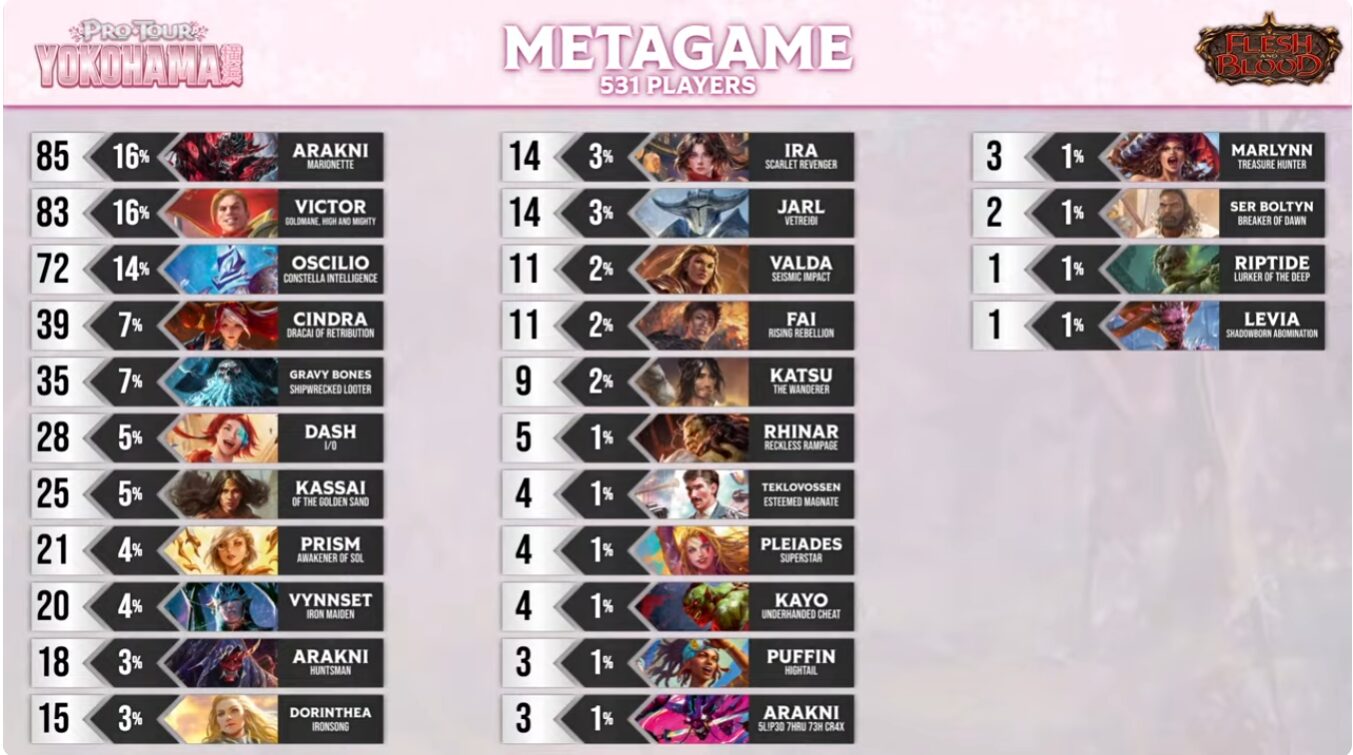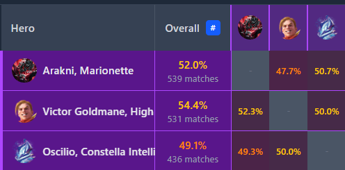 最多使用ヒーローでも16%という、群雄割拠のメタが継続している状態です。《傀儡・アラクニ》と《オシリオ》はここ3か月ほど常に使用者が多い2ヒーローですが、《ヴィクター》は《ヴァーダンス》と《ケイヨ》のLL以降、メタ的に立ち位置が良くなっており、使用率2位まで上昇する結果となりました。雑多なメタではありますが、《傀儡・アラクニ》《ヴィクター》《オシリオ》の3ヒーローが環境の中心と言えるでしょう。