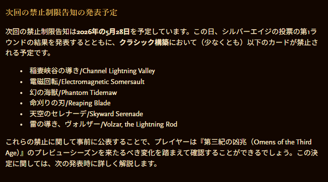 特に武器《雷の導き、ヴォルザー》の禁止予告は致命的であり、現在のデッキタイプのまま戦うのは不可能になるでしょう。