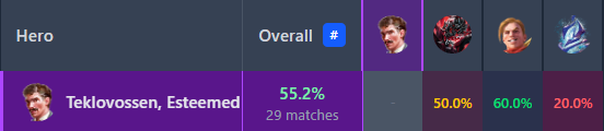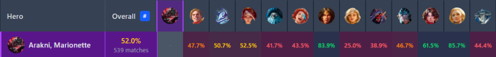強力な「激突」ブロックカードの存在により、《ダッシュ I/O》や《シンドラ》など地上戦をしてくる多くのデッキに優位を取ることができ、《オシリオ》や《傀儡・アラクニ》にも五分の戦績を誇ります。使用者トップ3のヒーローの中では最も平均勝率が高いヒーローとなりました。